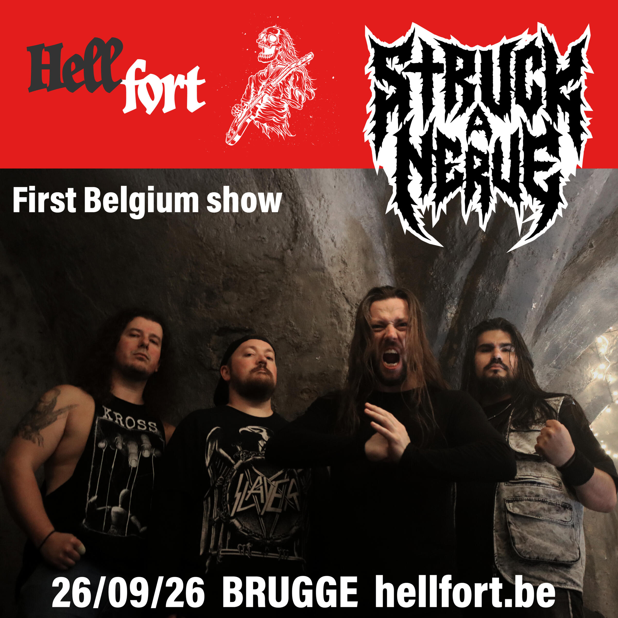 With their debut album they are tearing a path through the scene like a sonic tornado.Driven purely by the truest underground spirit, they have sold out shows, broken every neck and are set to become a leading force in thrash. This is only the start. STRUCK A NERVE are placing themselves at the top of the food chain and the metal world is discovering a new apex predator.Drawing on a hardcore and brutal thrash background including the likes of Sodom, Demolition Hammer, Power Trip, Enforced, and Slayer, this all-star thrash band have the opportunity to show you their pedigree with the forthcoming album (released: nov. 28th), a modern classic.Their performance at Hellfort will be their first show ever on Belgian soil. We're pretty sure in ten years from now, in some rockumentary, they'll think back of those festivals where they were welcomed for the first time.The stars are already aligning to make that happen: Best metal album in december in Aardschok, cover mention in Rock Tribune and spotify monthly users skyrocketing.Can't wait for this Nocturnal terror to happen on their Parade of violence...