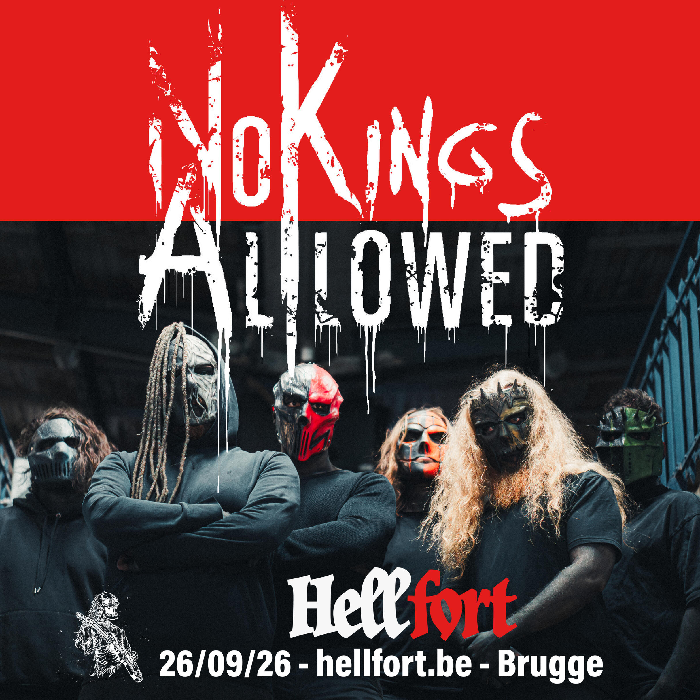 Some bands create songs. No Kings Allowed builds worlds.Formed by musicians from the Netherlands and Belgium, this six-piece outfit treats heavy music as a canvas rather than a rulebook. Deathcore aggression, metalcore structure and cinematic, almost symphonic layers are blended into songs that feel expansive and emotionally thought out. Chaos is there, sure — but it’s shaped and breathing.In just two years they released over 30 songs, passed 300,000 streams and dropped A New Era, a record that sounded confident far beyond its age. Rather than repeating themselves, they pushed forward. Dark Reign is darker and more personal, shaped by setbacks that forced the band to rethink who they were and how they present themselves. (They got robbed before their European tour actually started, you might have heard of it).Live, No Kings Allowed thrives on connection. Their shows move fluidly between intensity and release, pulling the crowd into something shared rather than something observed. It’s heavy music that invites you to be part of it. On Hellfort!